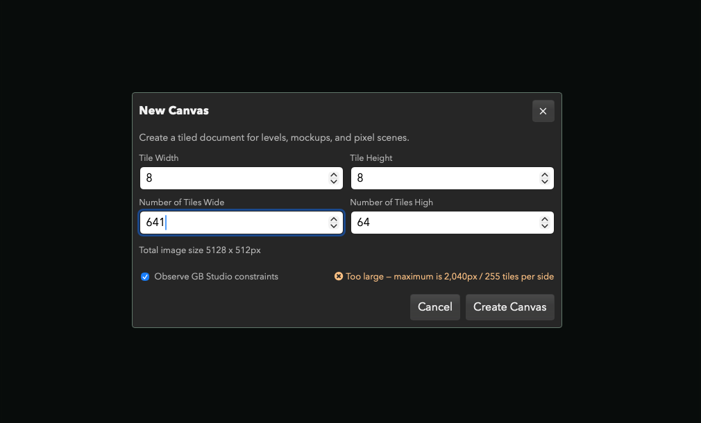 - GB Studio dimensions check – check a new canvas against level limits, both in dimensions and stopping non whole tile dimensions (causes GB Studio compile issues)