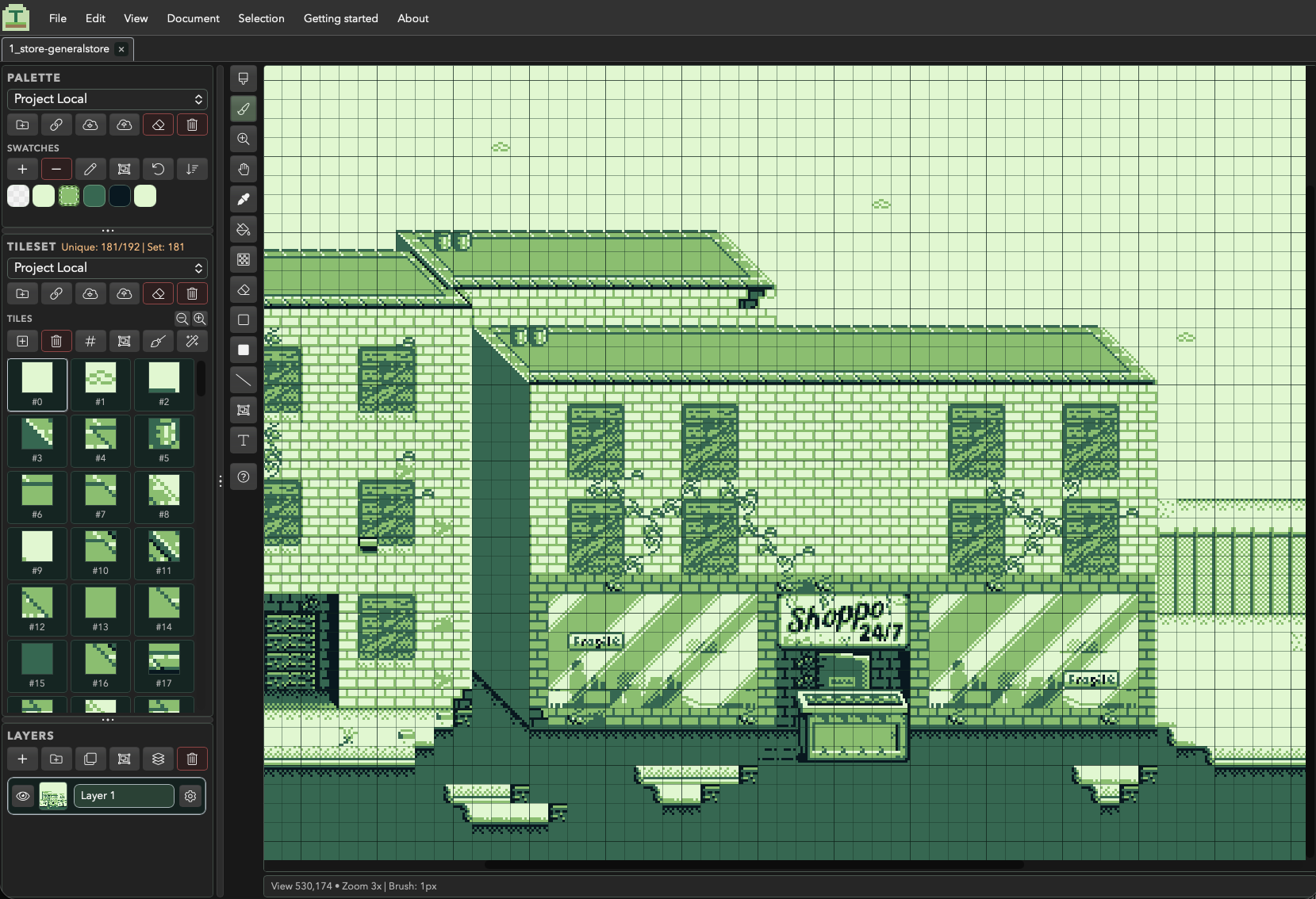 - Precise tile edit mode – right click on a tile in your tile set to focus in and edit with the brush tool directly from the tileset (pinch/wheel to zoom in). Changes updated in real time in the canvas.